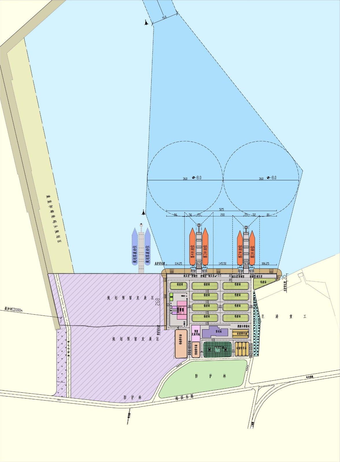 建设规模:建设10000总吨滚装泊位2个、20000总吨滚装泊位2个,泊位总长度930米,总长805米,陆域回填14.3万平方米。