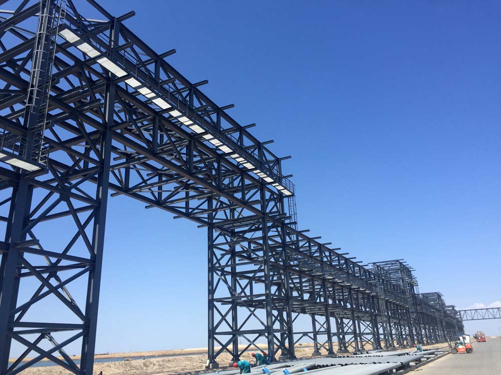 公共管廊总长度约35Km,主管廊总宽度为9m,其中柱心距6m,两侧各悬挑1.5m。支管廊总宽度为6m,其中柱心距3m,两侧各悬挑1.5m。上部结构采用钢桁架结构,纵向由钢桁架相连接。下部基础为预制预应力高强混凝土管桩接承台形式。