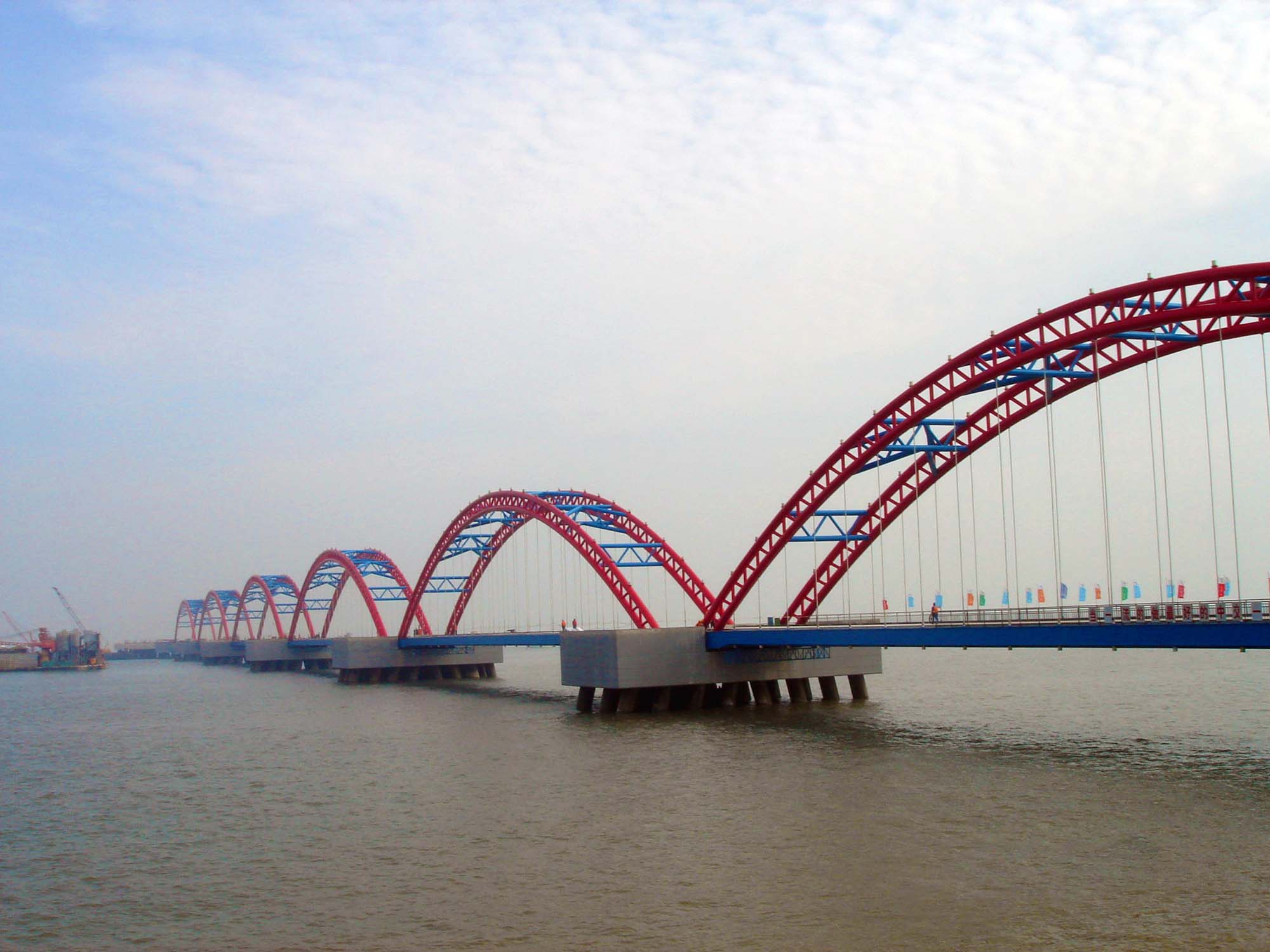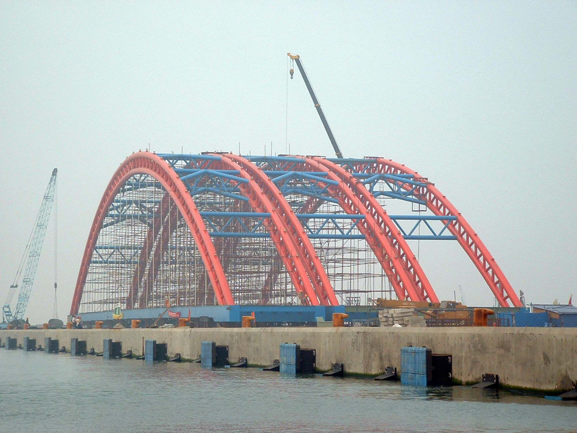 施工方面,本桥采用了陆上支架拼装,整体海吊吊运就位的施工方案,并获得圆满成功。该桥在当时创造了钢制拱桥海上整体吊装长度最长、重量最重两项国内同类施工新纪录。