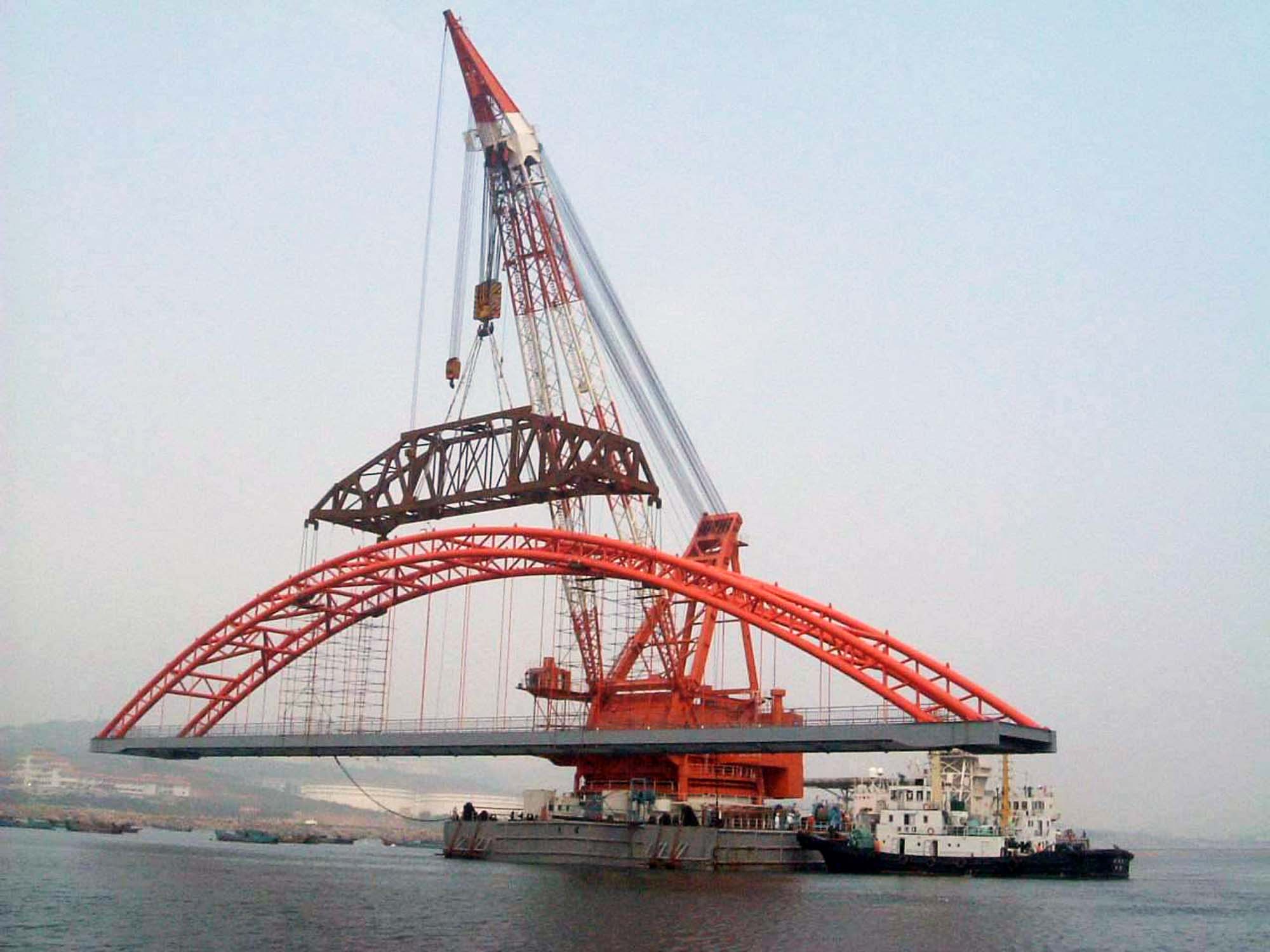 引桥采用5 跨112.6m 简支下承式刚性系杆钢管混凝土拱桥。在设计中,我院提出了空桥陆上支架拼装,整体海吊的吊运安装就位施工方案。