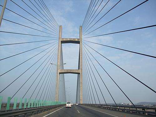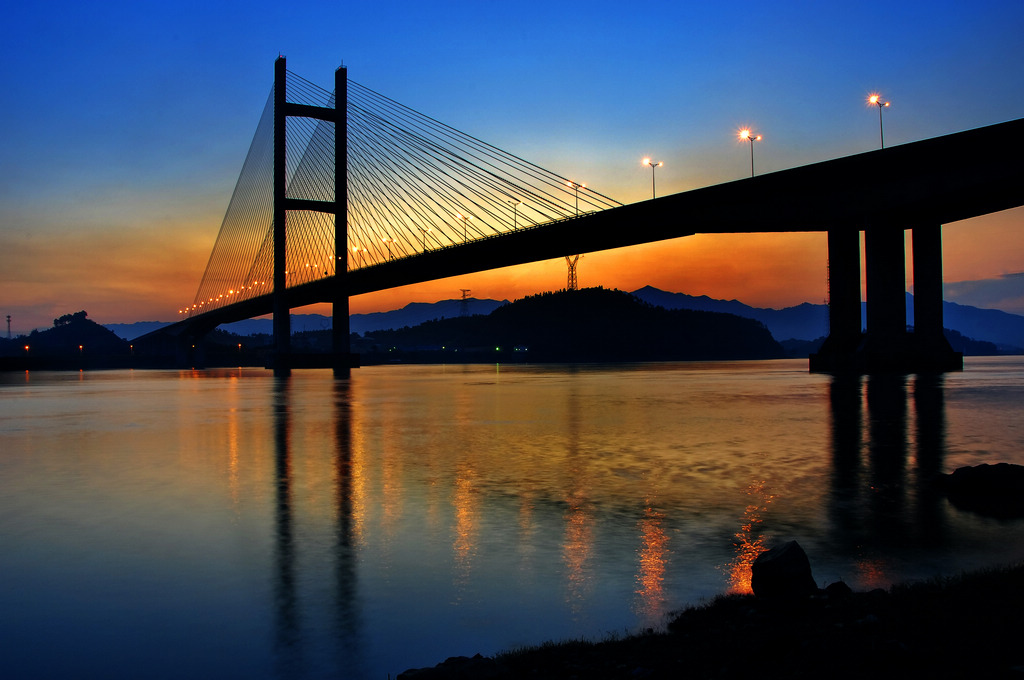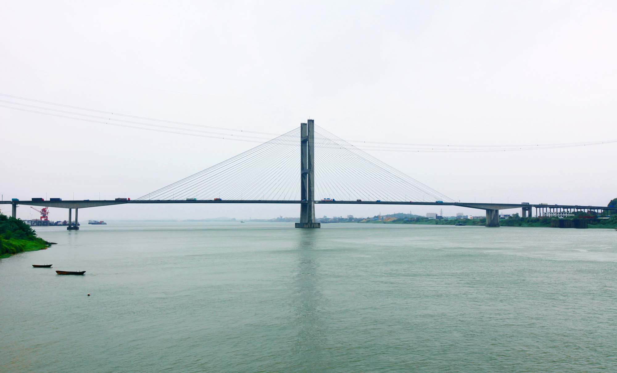 广东省金马大桥(60+2×283+60)m,斜拉桥与T 型刚构协作体系,是世界上跨径最大的独塔砼斜拉桥。 获2003 年度教育部优秀设计一等奖、建设部优秀设计一等奖、大连市优秀设计一等奖。